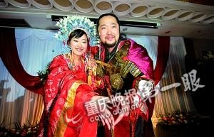 身着盛装的美丽公主,在《皇上登基》的音乐声中,与身高七尺、满身铠甲的帅气“将军”牵手走进婚姻殿堂———这不是古装剧,而是昨日在解放碑新华酒店举行的一场个性化创意婚礼。