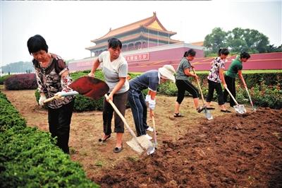 王先生说,他们于当天下午赶至天安门,并依据国庆花卉布置方案开始施工。记者看到,工人们在花池里依弧线掀除草坪,露出的土壤呈裙边状。被掀的草坪堆积在花池外侧,工人们随即用铁锹深松土壤,以备国庆摆花之用。 (记者王硕)