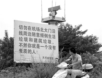 黄陂天河镇的城管部门,天河机场北大门路旁竖起一面标语:“切勿在机场北大门沿线周边随意倾倒生活垃圾和建筑垃圾,不然你就是一个没有素质的人”,让不少过往旅客大跌眼镜。作为警示标语,这样的遣词造句确实值得商榷。(高星)