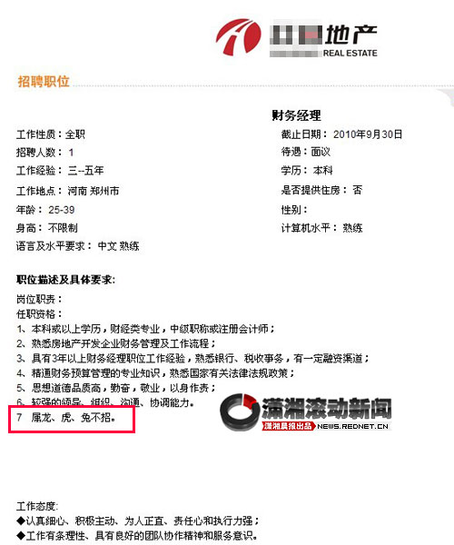 招聘单位为河南一家房地产公司,招聘职位为财务经理,招聘截止日期为2010年9月30日。招聘广告在“职位描述及具体要求”一项中列出七条要求,除了相关学历、经验和个人素质要求外,第七条就是被网友认为“很搞笑”的一项:“属龙、虎、兔不招。”