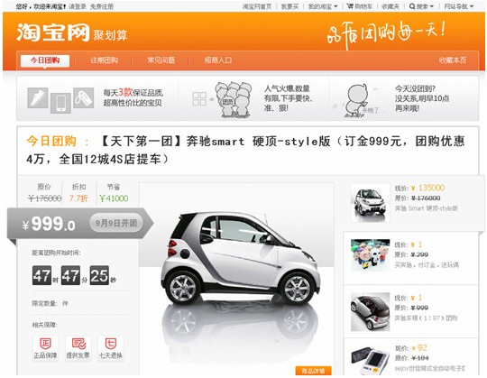 据了解,除了团购活动,奔驰还提供一辆SMART车供淘宝用户进行1元秒杀。同时提供150辆SMART车模,供用户以1元的价格进行团购。