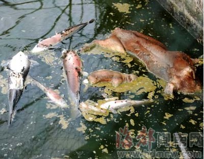 漂浮在鱼塘里的死猪、死鱼,发出阵阵恶臭
