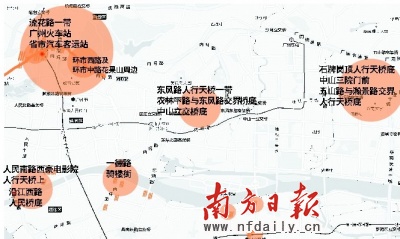 南方日报记者连续3个月走访,绘出广州中心城区“乞讨地图”,图中橘黄色为乞丐集中区。