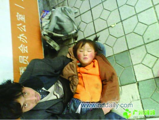 网友贴出广州体育东路附近一男子抱小女孩路边乞讨的照片。照片中小女孩昏沉沉地躺在男子膝盖上,样子与紫轩非常相像(小图)。