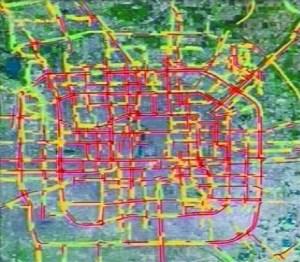 昨日晚高峰城区路况图(红色为拥堵路段)。视频截图