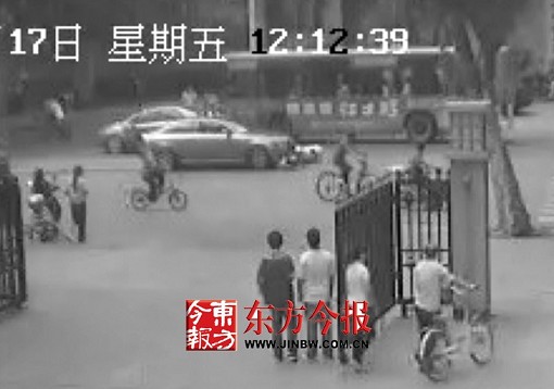 12时12分30秒,一男子骑电动车由东向西横穿家属院门口的斑马线时,被一辆奥迪轿车撞倒。