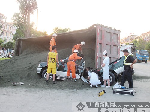 9月18日下午6时许,在田东县东宁路大西南十字路口,一辆运送沙石的大货车侧翻压住一辆皮卡车,皮卡车上的5人当场死亡。
