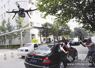 同济医学院家属区,羞答答的新娘子还没下楼,手持遥控器的老吴就在单元门外忙开了。他亮出一个黑色的“UFO”,上面有4个螺旋桨和一台微型高清摄像机。“UFO”长着4条长腿,可以架在地上。