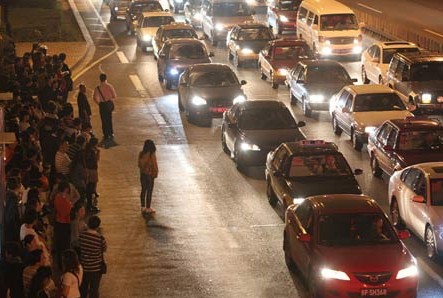 资料图片:9月19日,北京建国门桥方向车行缓慢,公交站大量乘客艰难等待公交车。