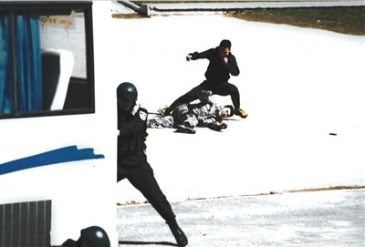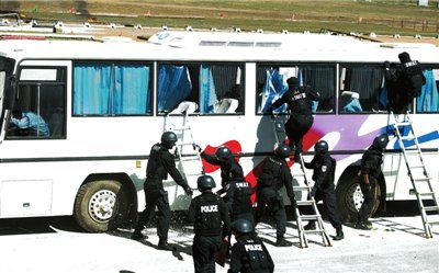 昨天上午,在京郊怀柔某训练场内,市公安局巡特警总队首次联合武警特警举行反恐处突联合实战演练,北京特警精锐“蓝剑突击队”和北京武警总队国家级反恐力量“雪豹突击队”同时亮相。演练中共出动特警队员400余人,大量反恐特种装备同时亮相。警方还特别针对菲律宾武装劫持大巴车事件进行了反劫持演练。
