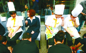 昨日上午,奇火锅店门口,穿着工作服的17名员工,齐刷刷地坐在靠背椅上,表情拘谨。当端着洗脚水的老板和高管在对面弯腰说出“很高兴为您服务”时,他们更显得有些紧张。