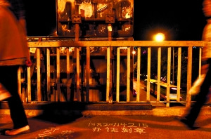昨天傍晚,刘家窑桥东一过街天桥,因护栏有缺口,一女童在天桥上玩耍时不慎跌下。实习生周岗峰 摄