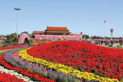 今年“十一”是共和国61岁生日,北京天安门广场被鲜花装扮得五彩缤纷,呈现一派节日气氛。