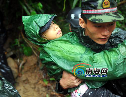 武警救援人员将一名小孩抱下山。(南海网记者汪德芬摄)