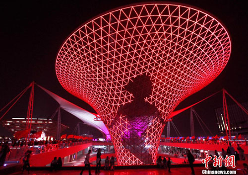 10月5日,上海世博会入园人数持续上升,超过43万人次;入夜后风清气爽,巨大的彩灯塔为游人展示绚丽多彩的画面。中新社记者 任晨鸣 摄
