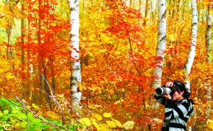 10月7日,游客正在京郊怀柔区喇叭沟门满族乡原始森林公园白桦林中观赏秋色。卜向东摄