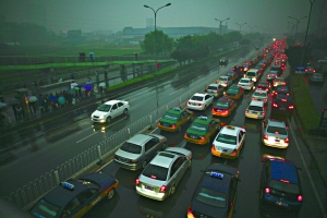 昨日,中关村东路,雨雾的天气,交通非常拥堵。记者 浦峰 摄