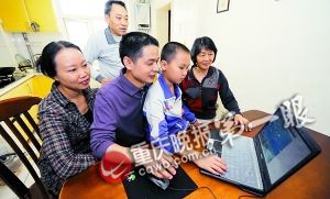 李波一家老小围坐在电脑前,测试他才开发的一款小游戏。 记者 冉文 摄