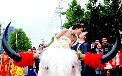 几分钟后,最后一辆婚车驶过,正当大家还在回味那支豪车队伍时,一名男子牵着一头壮实的白色牦牛走上了红地毯。这头牦牛雪白的长毛垂地,两只牛角弯曲对称,四肢粗壮有力,立即吸引了围观者的目光和镜头,现场只听到“咔嚓”的快门声和阵阵感叹声。“这头牦牛价值十多万元,专门用车从云南香格里拉运送来的!”听到有人问话,牦牛的主人小声说。
