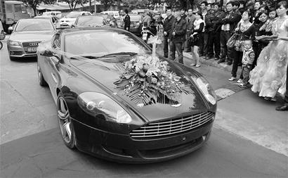 “来了,来了!”中午12时许,长长的车队从远处驶来,前面的黑色婚车竟是价值470万元的阿斯顿马丁!但新郎新娘却没有按传统“躲”在豪车里,而是站在了其后扎满了粉色莲花、长七八米的花车上!接着,15辆奔驰车缓缓经过红地毯,看得众人眼睛发直。