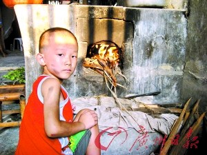 费力地点燃柴火,小炜脸上身上抹上了炭灰。