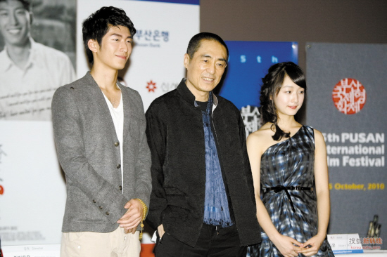 资料图片:张艺谋(中)带周冬雨、窦骁亮相釜山