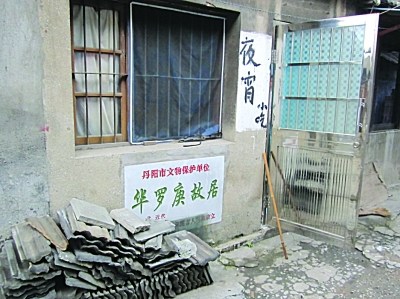 华罗庚先生是驰名中外的数学大家,华罗庚祖籍是丹阳访仙,华罗庚的祖居坐落在访仙古镇东街,坐北朝南,其房共三间,砖木结构。华罗庚的故居是中间一间。由于华罗庚故居的文物价值,2007年12月,该市政府公布其为丹阳市第五批文物保护单位。昨日,记者在访仙老街上看到,华罗庚故居前的“丹阳市文物保护单位”标识牌格外醒目。但遗憾的是,临东街的故居外观已经被住户部分改造,粉上了水泥,窗户改造成不锈钢的。而标识牌旁的墙体上被写上“夜宵小吃”的字样。原来,故居已开了小吃店。