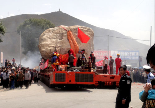 据说,这块石头将近400吨,当地有关部门专门请了上海一家搬运公司,还特别使用了功能先进的吊机王才给他吊上车。9公里的路走了4个小时。这搬家费,高达500万,另有一种说法是1000余万。不要看古浪县这么大手大脚,就以为它财大气粗,实际上,古浪县是一个国家级贫困县,2009年1至10月,全县完成大口径财政收入仅7044万元。不少家庭还不能填饱肚子,县里的老百姓听说石头搬家花了这么多钱,都大喊心疼。县里为什么要这么干呢?