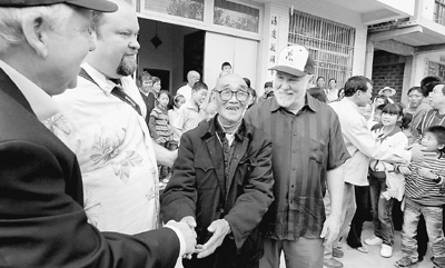 10月17日,湖北省监利县周老嘴镇罗家村,当年参与营救本尼达的农民周孝汉(前排右二)来到现场,本尼达的儿子爱德华(左一)上前热情地握住他的手表示感谢。