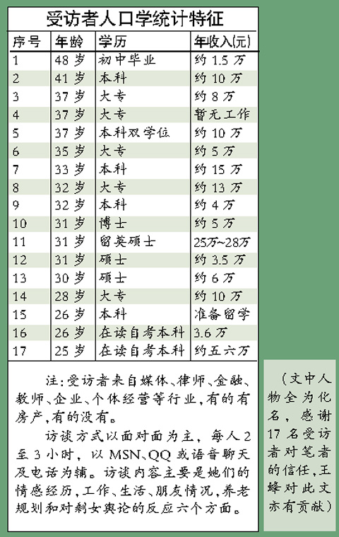 剩女为什么没结婚?她们的生活究竟过得怎么样?从4月至9月,笔者通过朋友介绍,对京沪穗及4个二、三线城市的17名25岁至48岁、未婚也没有男朋友的女性进行了深度访谈,力图了解她们最真实的内心世界、生活状态以及所面临的困境。