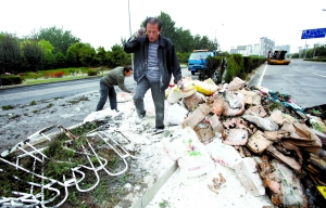 昨日,朝阳区十八里店南桥博大路北口,一辆运粮的厢式货车撞上路中央的隔离栏后起火,车内父女俩逃生。火险被消防员扑灭后,一些人帮助抢救粮食,还有一些人顺手偷拿物品。