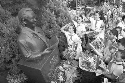 9月10日,全国首批特级教师、被温家宝总理称为“把爱献给教育的人”、“爱的教育”的倡导者和实践者——霍懋征铜像揭幕仪式在北京实验二小举行。图为该校师生为霍懋征铜像献上鲜花和红领巾,纪念这位杰出的教育家。张斌摄(资料图片)