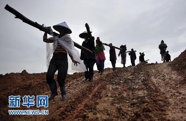 10月18日,海南省陵水县竹俐水库周边村庄的群众正在搬运木桩,加固堤坝。据海南省气象台消息,超强台风“鲇鱼”中心附近最大风力达17级,正以每小时25公里左右的速度向偏西方向移动,将于18日夜间进入南海东部海面,逼近海南岛。目前,海南省陵水县正加紧水库泄洪和加固病险水库,全力准备迎战“鲇鱼”。新华社记者 郭程 摄
