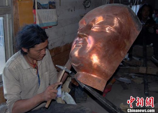 根据顿珠的介绍,打佛像的工序一般分为敲、焊、烧,10个人各有分工。“难度最大的是佛像的头和手”,顿珠说,打佛像没有模型,全部靠常年累计的经验和工艺感觉,只有经过专业训练的人才能胜任。