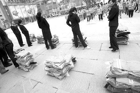 昨日上午10点20分,记者接到热线电话后,赶到了现场。临街的升龙国际广场上,站着60多名身着土灰色工装的环卫工。环卫工前面放了几摞衣物,由几名穿着蓝制服的工作人员看着。有人说,这些衣物是等领导慰问时发给环卫工的。环卫工们站在广场上聊天,由于天冷风大,他们时不时搓手跺脚,还有人不时抹着流出来的鼻涕。
