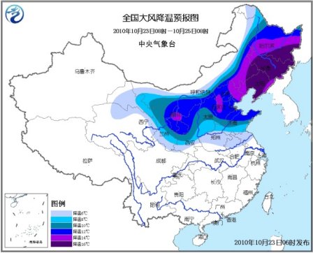 根据这份寒潮蓝色预警,预计,10月23日08时至25日08时,内蒙古大部、东北、甘肃大部、西北地区东部、华北、黄淮、江淮北部等地将出现6~12℃降温,其中,宁夏中部、河北西部和东北部、内蒙古东南部、东北大部等地的部分地区降温幅度可达14~16℃;上述大部地区有4~6级偏北风。