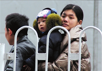 昨天,在北京街头,孩子被家长包裹严实抵挡寒流。