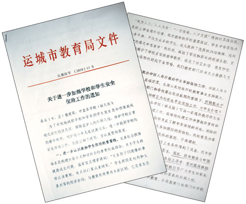 开会—发文—层层落实,这套惯用流程被运城多家学校称为“十多年不变的模式”。几年来,运城市教育局针对“学平险”多次发文、开会,而外界批驳之声不绝于耳。