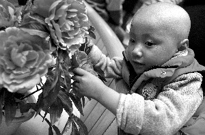 几近失明的宏璇用手摸索着花坛里的花。昨日,患有视网膜母细胞瘤的宏璇住进了武警总医院。记者 吴江 摄