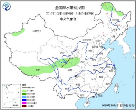 10月31日08时至11月1日08时,新疆南疆盆地西北部、内蒙古东北部、黑龙江西北部、西藏南部、青海东南部、甘肃南部、川西高原北部等地有小雨(雪)或雨夹雪;陕西西南部、四川北部等地的部分地区有小雨或阵雨。内蒙古东部、东北地区等地有4~6级风。台湾海峡、台湾以东洋面和以南海域、南海东北部、中部和西南部海域将有7~8级、阵风9级的东北风;东海东北部和南部海域、南海西北部海域将有6~7级、阵风8级的东北风。