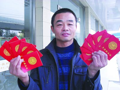 宋强向记者展示他的14本献血证。旺财 凌云 摄