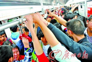 ②4日的体育西路站,车厢内的乘客拥挤不堪。记者乔军伟摄