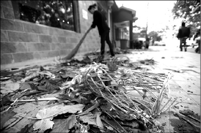 大量鲜花残骸散落,店内的服务员正在清扫。本报记者 潘之望 摄