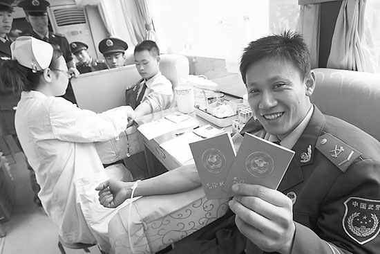 重庆籍老战士张健在展示献血证,当兵5年他已献了6次血。李博摄(资料图片)