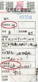 当事医生随后被叫来与家属见面,这位左医生说,死者原本是另一位肖姓医生的病人,当时死者家属等了很久,但肖医生一直很忙,便叫他代开证明,“证明一共有三联,一联是给医院的存根,一联给派出所销户口,另一联给殡仪馆。我们查过,存根那一联没写错。”