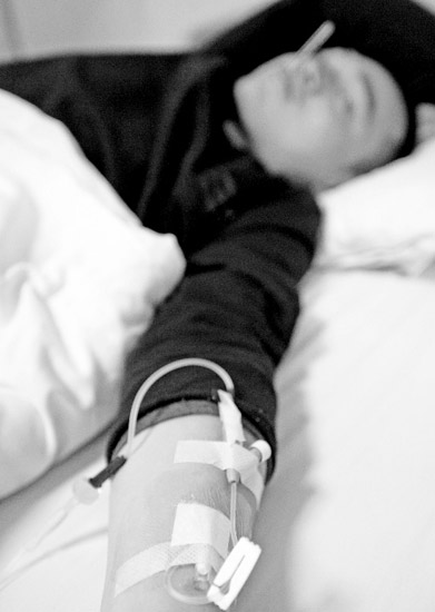 昨天下午,省中医院急诊科,记者见到詹晓同(化名)的时候,他正躺在病床上输液,一脸平静,嘴里还插着一根温度计。