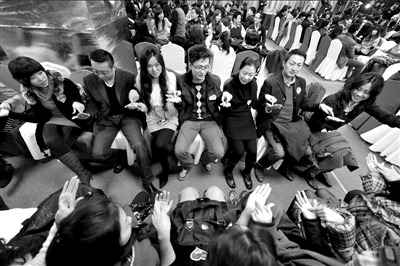 男女光棍围成一圈做抓手指游戏,快速结识身旁的异性朋友。记者张斌摄
