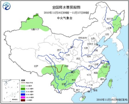 16日08时至17日08时,新疆北部、黑龙江东部、吉林东部、西藏东部、川西高原等地有小到中雪(雨)或雨夹雪,其中,新疆北部山区和天山地区局地有大雪;西南地区大部、浙江、福建北部、江西东部、海南东部以及台湾等地有小雨或阵雨。新疆北部、内蒙古中东部、东北、华北等地以及东南部沿海地区有4~6级风,新疆山口地区风力可达7~8级,青藏高原局地有6~8级西北大风。台湾海峡、台湾以东洋面和以南海域、南海东北部海域将有7~8级、阵风9级的东北风;南海西北部和中部海域将有6~7级、阵风8级的东北风;