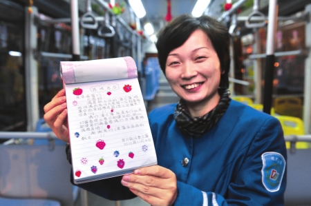 如今,“卡通公交”上挂起了留言簿,司机钟雪梅开始与乘客纸笔互动。留言簿上,钟雪梅用上了网络流行的“火星文”和“华康少女体”,乘客则用打油诗和简笔画与其PK。