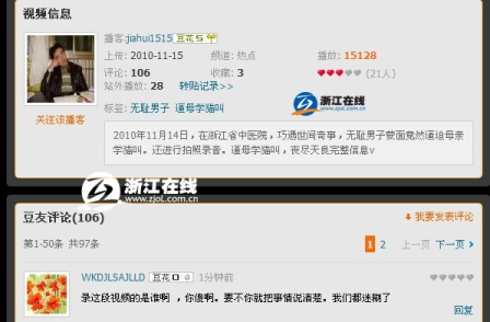 正当网友为此而感动时,一个《无耻男子逼母学猫叫》的视频也在网上流传,视频中一位蒙面男子在医院“逼”一位母亲当众学猫叫,引来骂声一片。这其中,既有人骂“逼”者不人道,又有人赞母亲之伟大,称是“慈母猫叫”、现代版的“鹿乳奉亲”。视频中的母亲,正是当众学唱《春天里》的董观荣,一位已经49岁的妈妈。